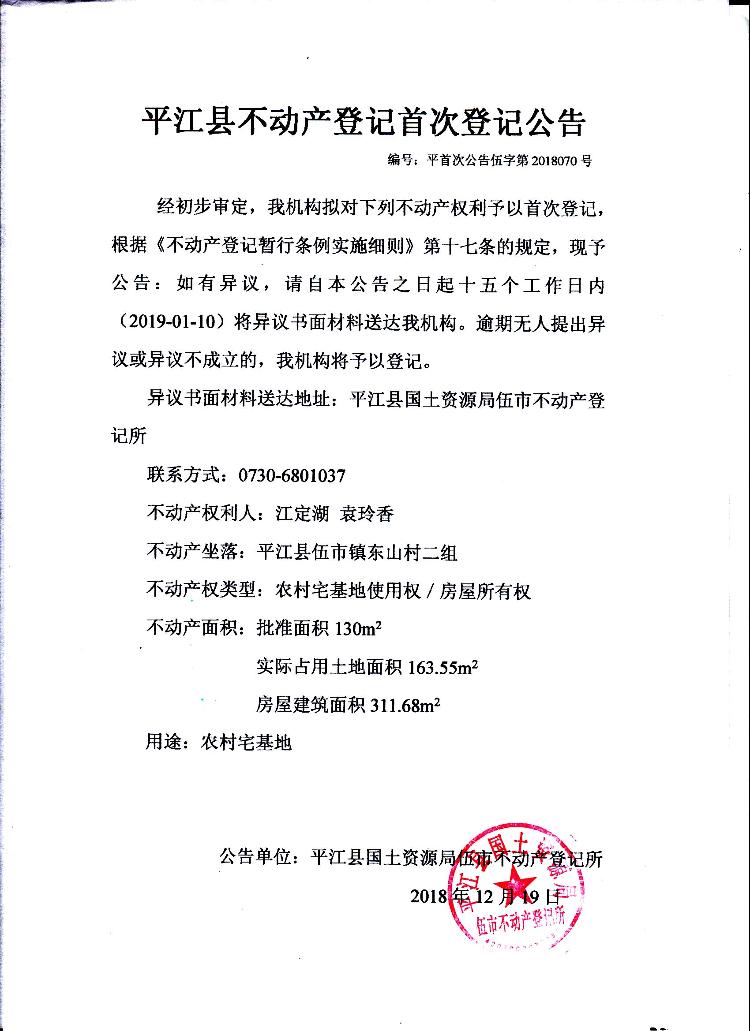 江定湖 袁玲香不动产首次登记公告伍字第2018070号