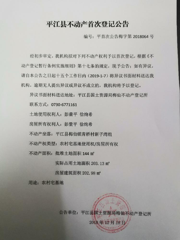 彭量平 徐绚希不动产首次登记公告 梅字第2018064号