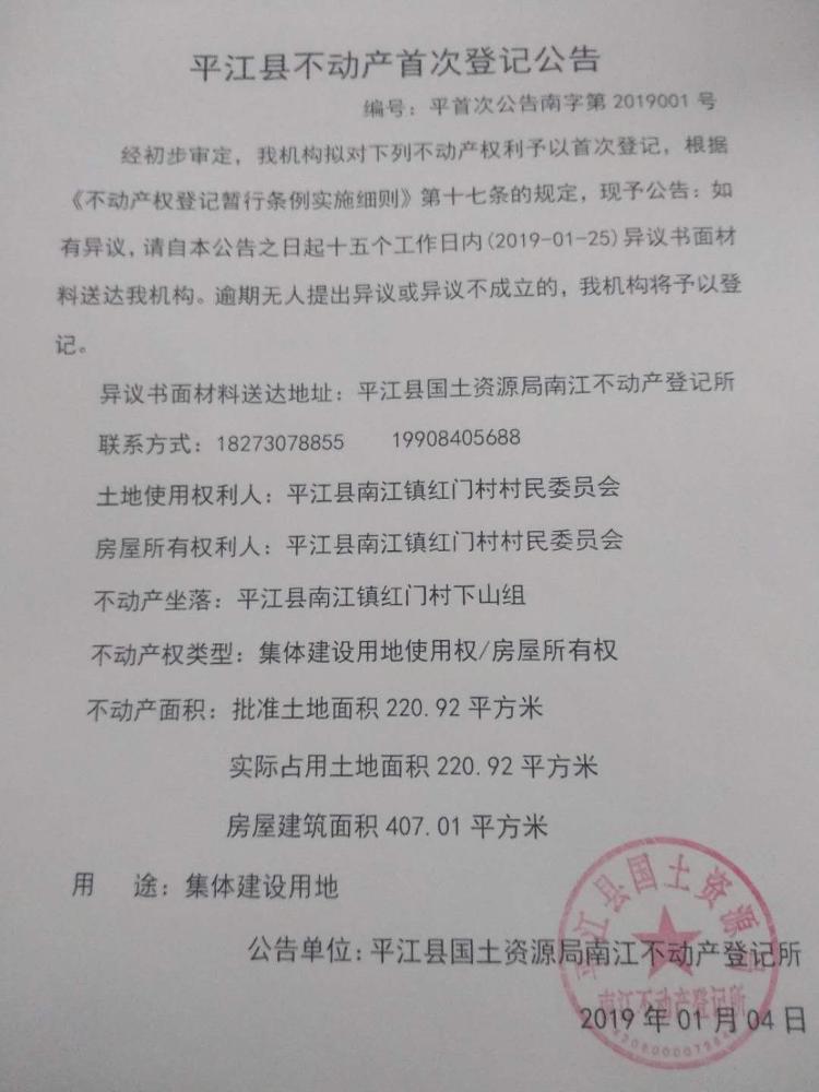 平江县南江镇红门村村民委员会不动产首次登记公告 南字第2019001号