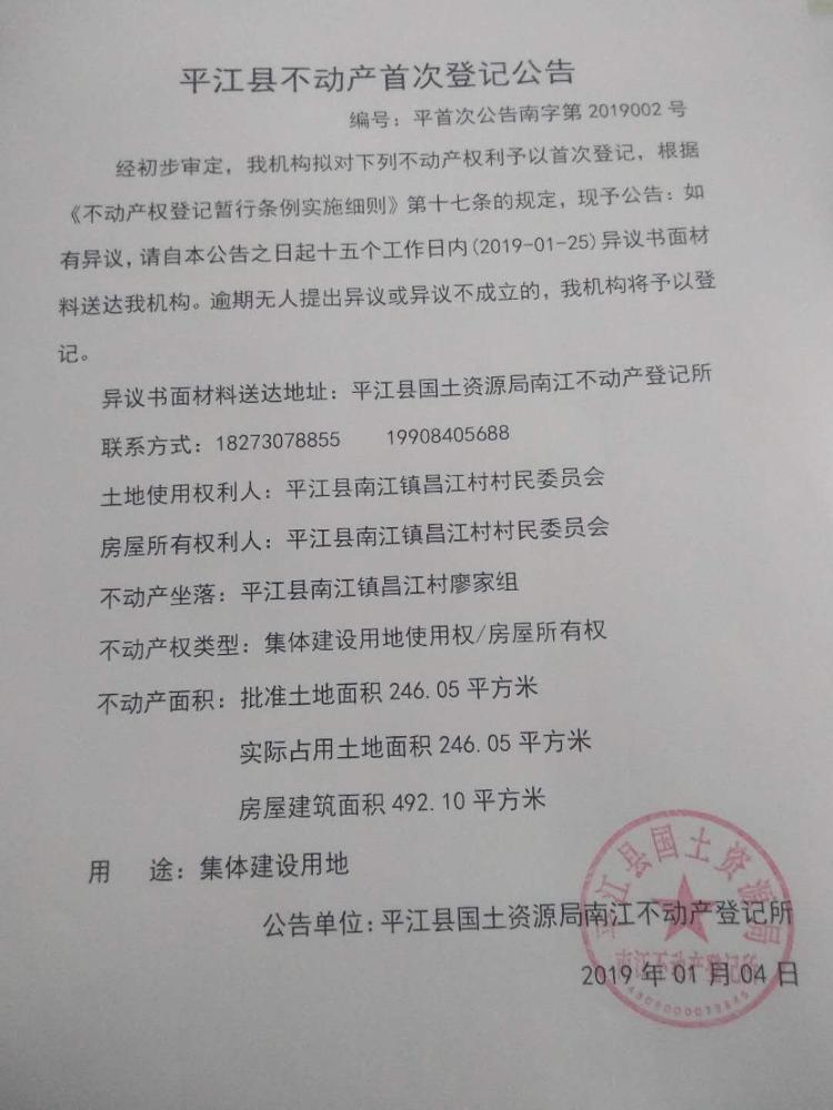 平江县南江镇昌江村村民委员会不动产首次登记公告 南字第2019002号