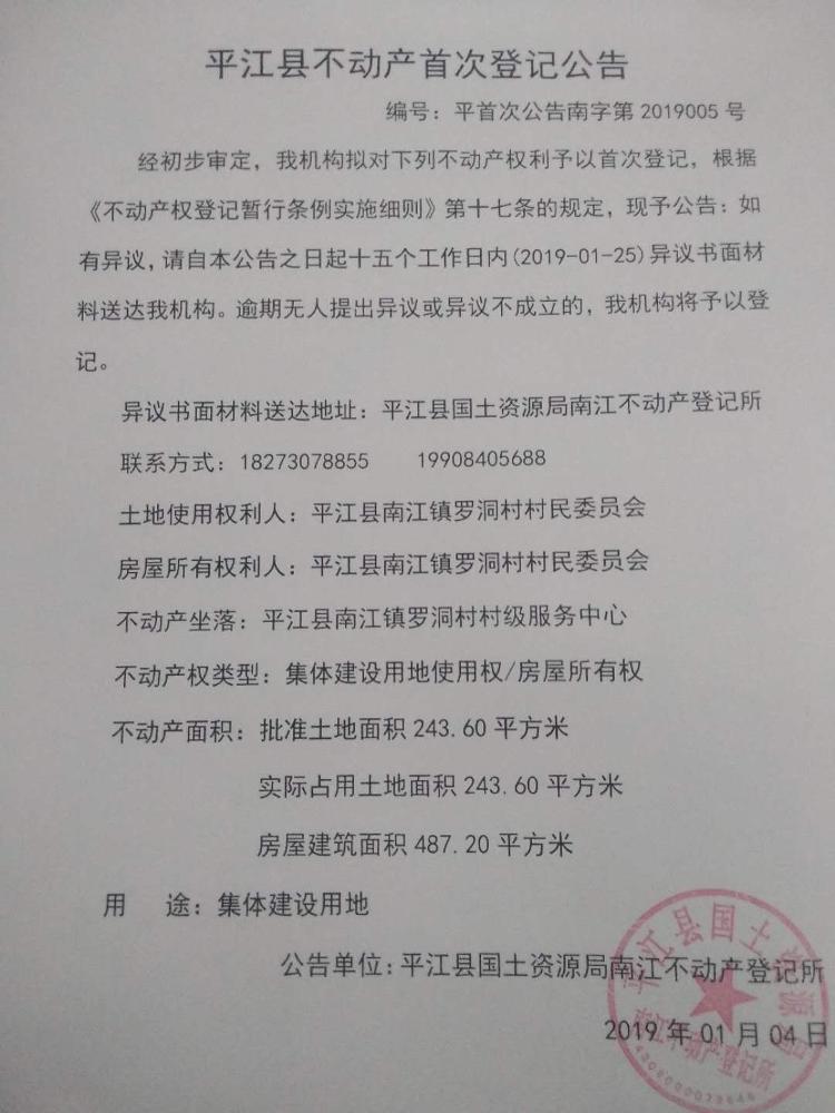 平江县南江镇罗洞村村民委员会不动产首次登记公告 南字第2019005号