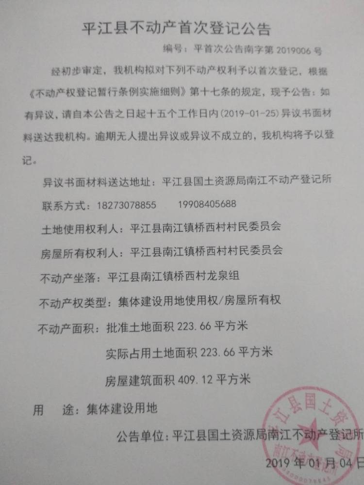 平江县南江镇桥西村村民委员会不动产首次登记公告 南字第2019006号
