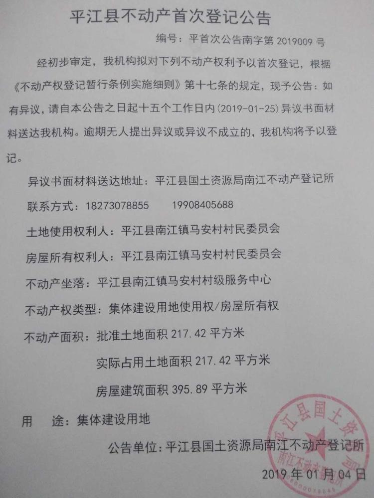 平江县南江镇马安村村民委员会不动产首次登记公告 南字第2018009号