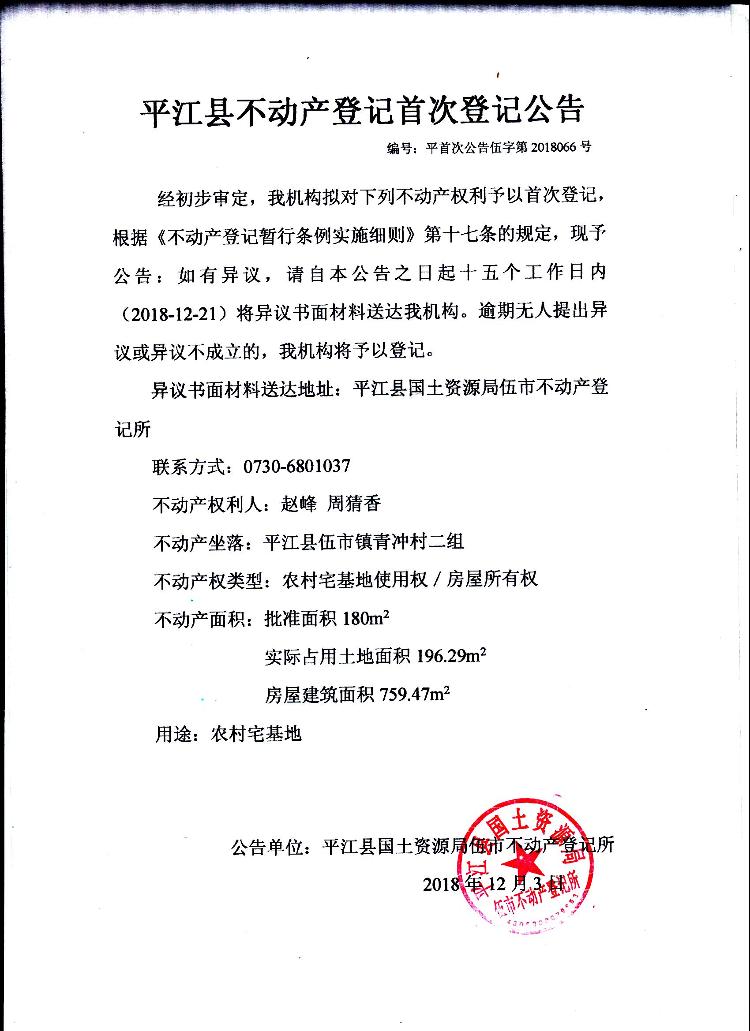 赵峰 周猜香不动产首次登记公告 伍字第2018066号