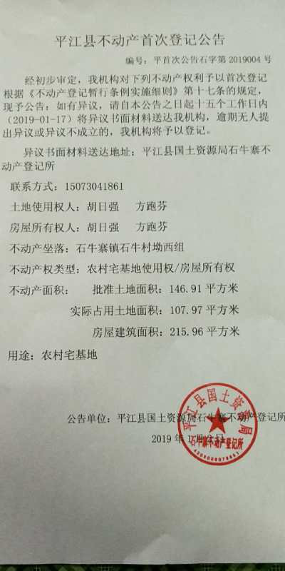 胡日强 方跑芬不动产首次登记公告 石字第2019004号