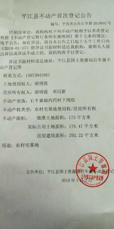 胡明霞 邓同新不动产首次登记公告 石字第2019002号