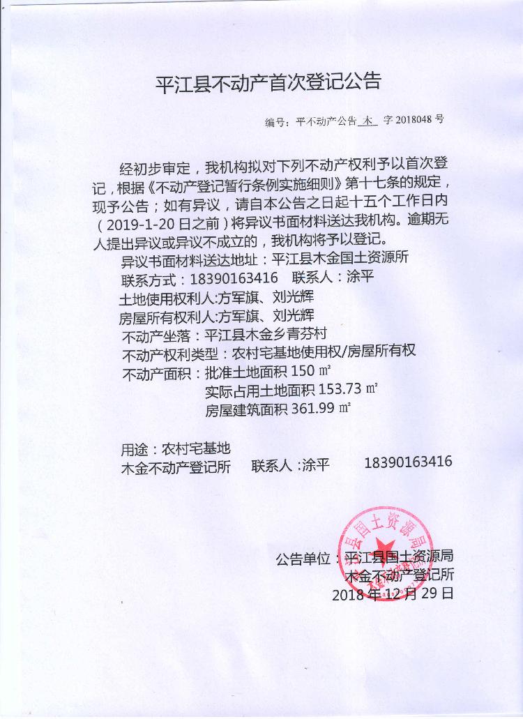 方军旗 刘光辉不动产首次登记公告 木字2018048