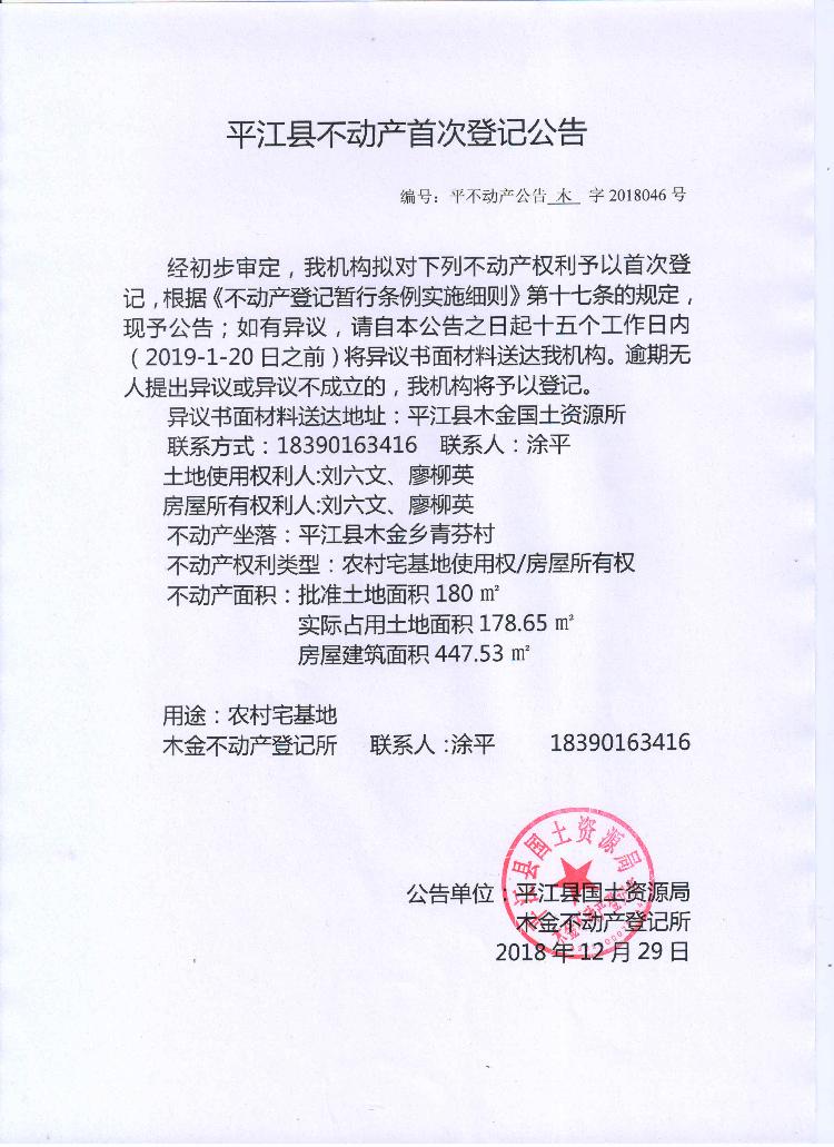 刘六文 廖柳英不动产首次登记公告 木字2018046