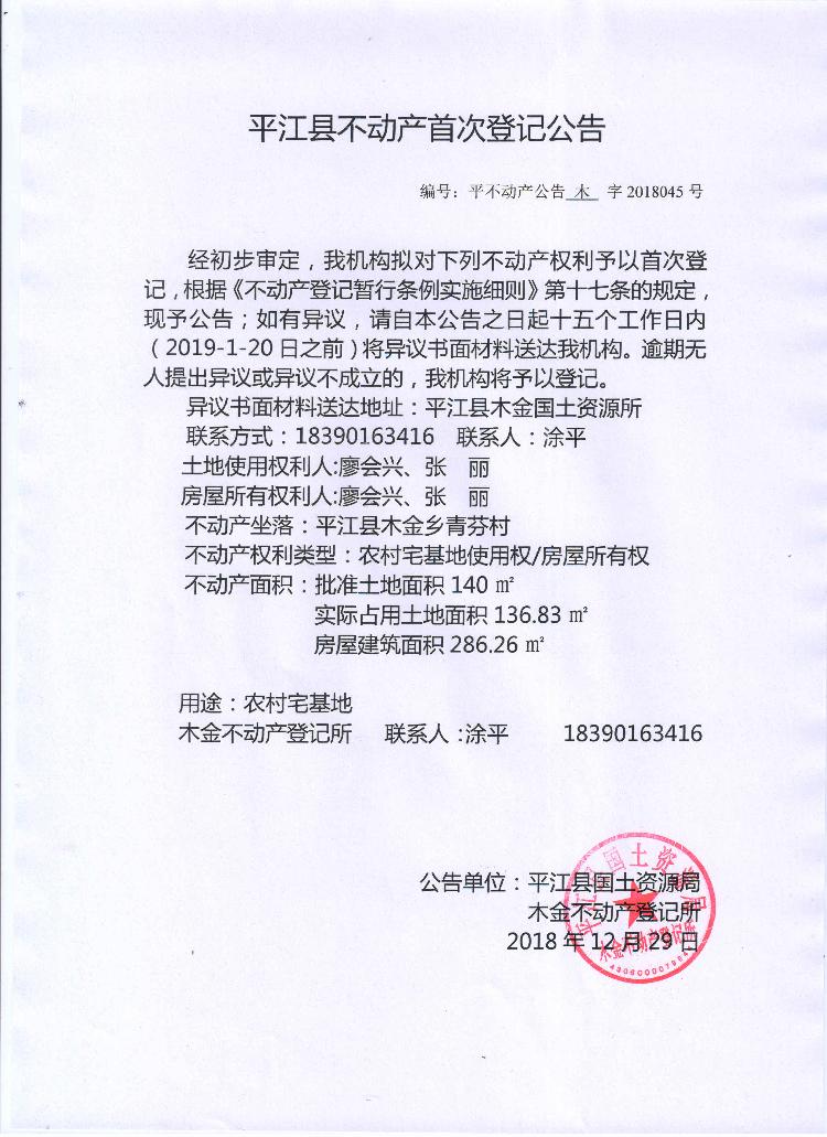 廖会兴 张丽不动产首次登记公告 木字2018045