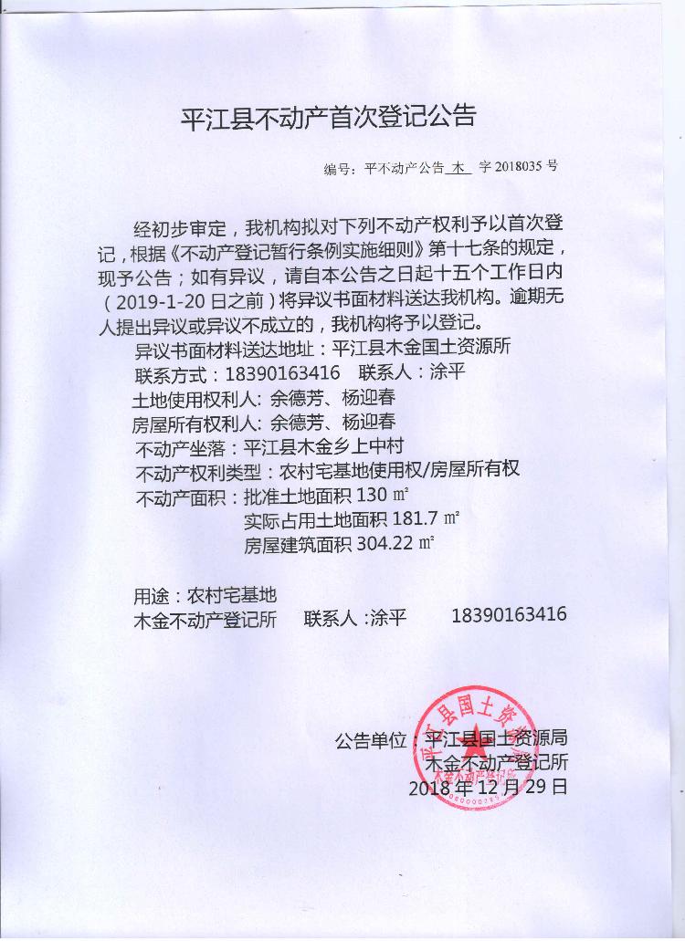 余德芳 杨迎春不动产首次登记公告 木字2018035