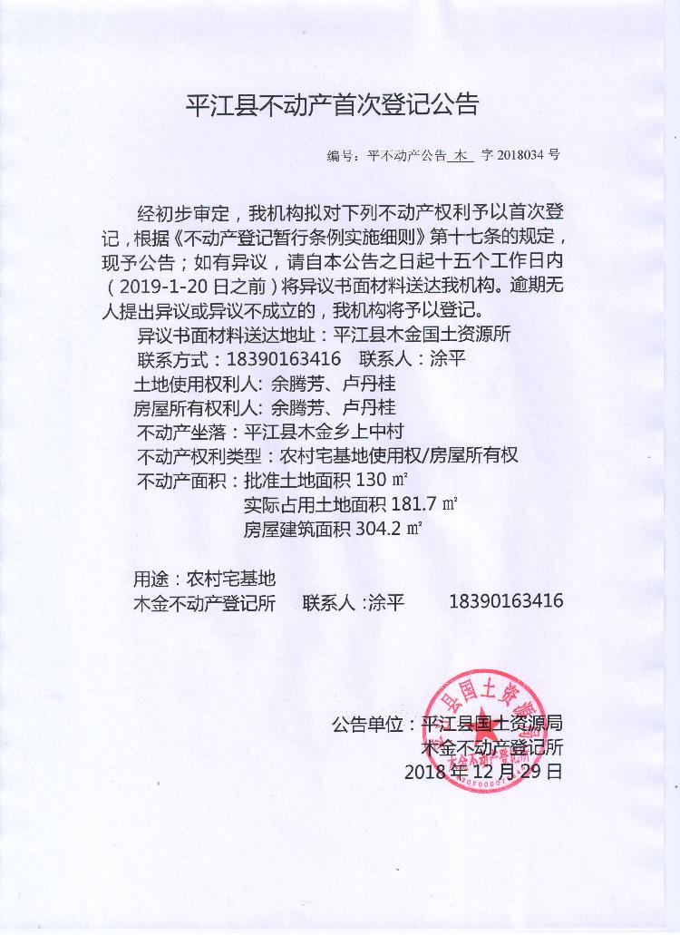 余腾芳 卢丹桂不动产首次登记公告 木字2018034
