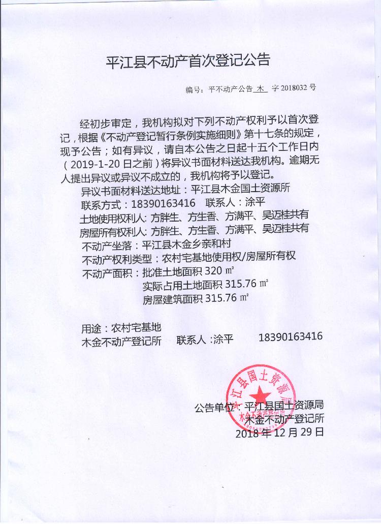 方胖生 方生香 方满平 吴迈桂两户联建不动产首次登记公告 木字2018032