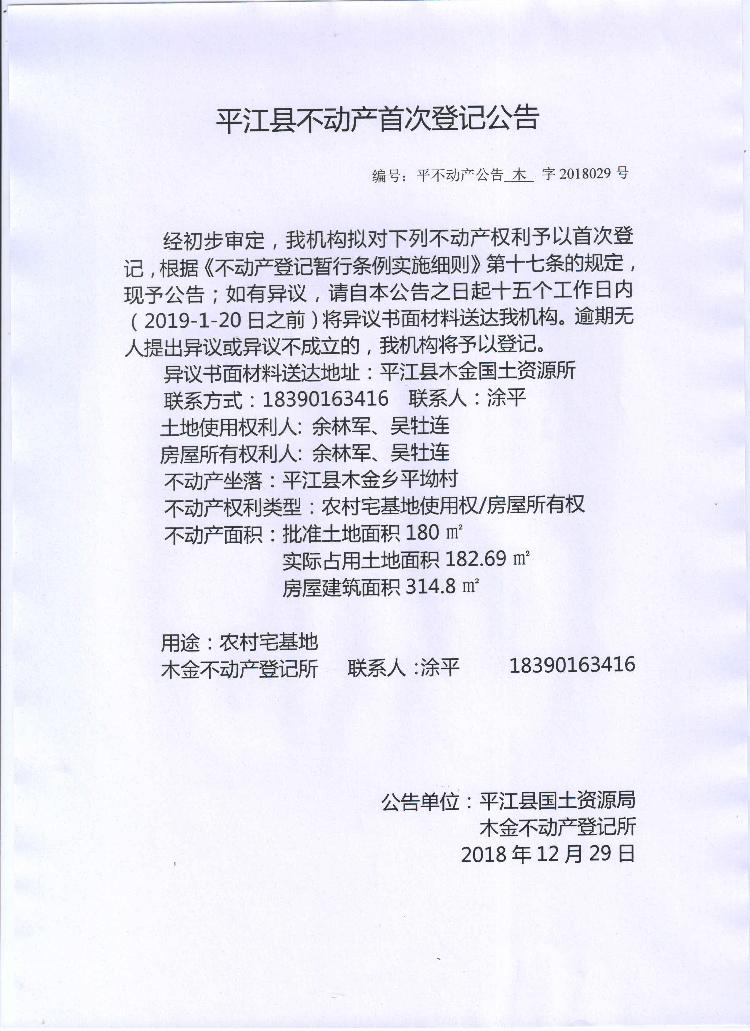 余林军 吴杜连不动产首次登记公告 木字2018029