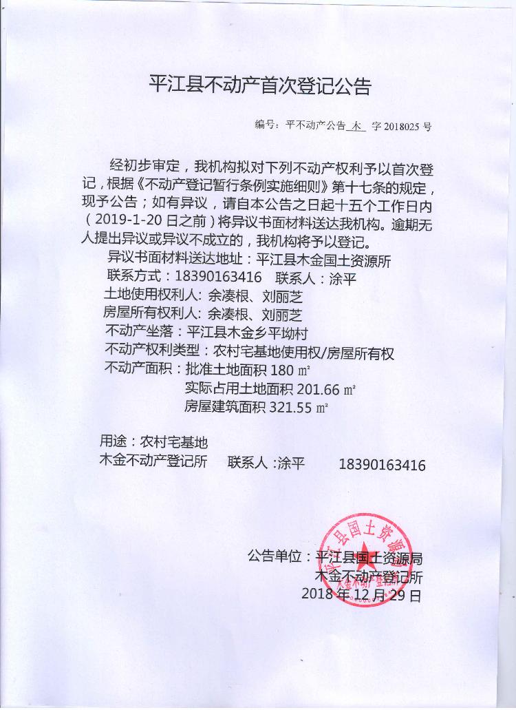 余凑根 刘丽芝不动产首次登记公告 木字2018025