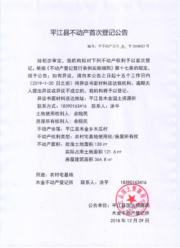 余院民平江县不动产首次登记公告 木字2018023