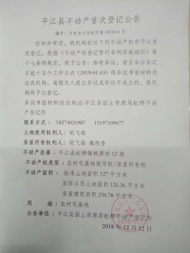 胡飞雄 魏视香不动产首次登记公告 虹字第2018191号