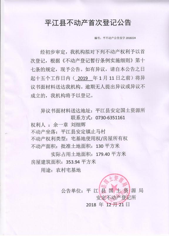 余一章 刘细辉不动产首次登记公告 安字2018224