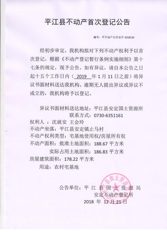 沈就安 王会玲不动产首次登记公告 安字2018226