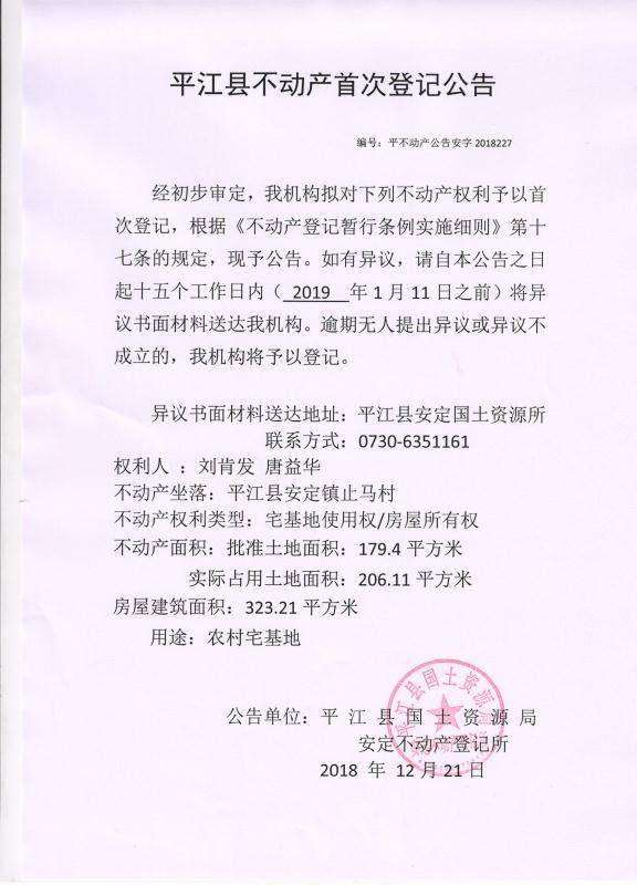 刘肯发 唐益华不动产首次登记公告 安字2018227