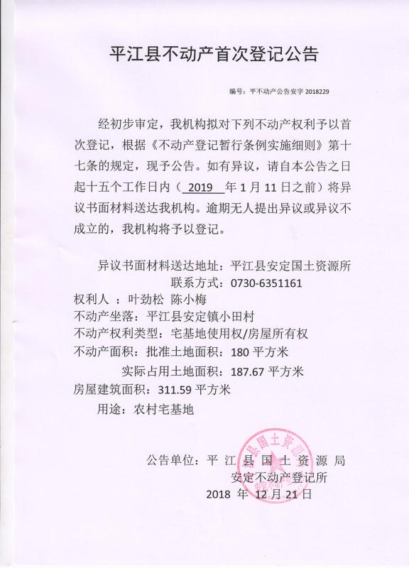 叶劲松 陈小梅丁含彬 李咏娥不动产首次登记公告 安字2018229