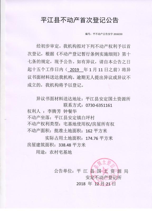 李腾芳 钟餐华不动产首次登记公告 安字2018230