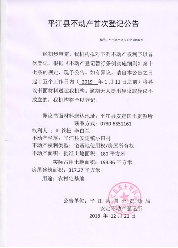 叶苍松 李白兰不动产首次登记公告 安字2018228