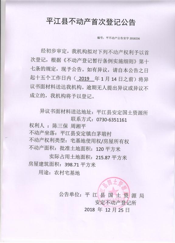 陈三保 周湘平不动产首次登记公告 安字2018236