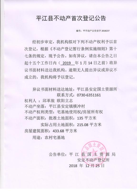 邱革旅 欧阳立志不动产首次登记公告 安字2018237