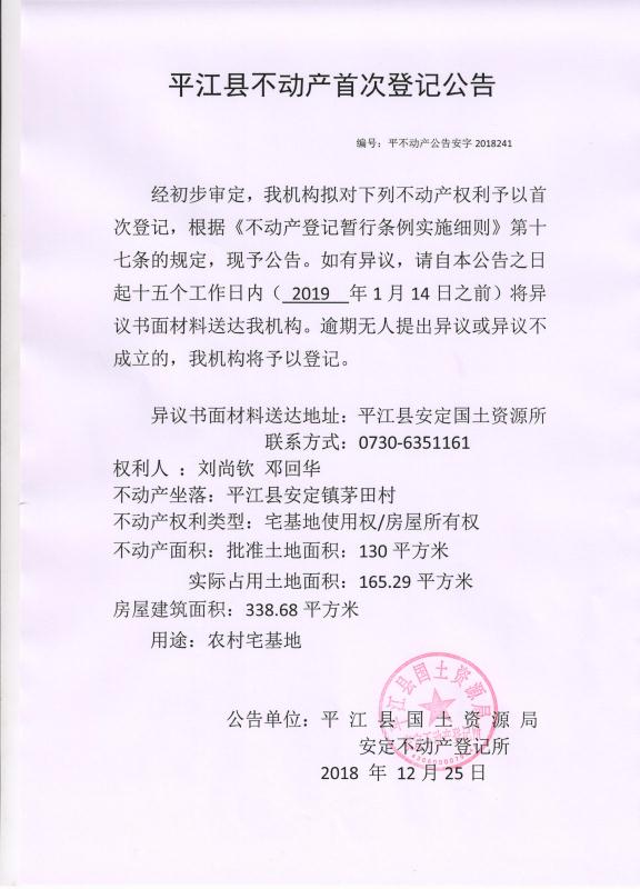 刘尚钦 邓回华不动产首次登记公告 安字2018241