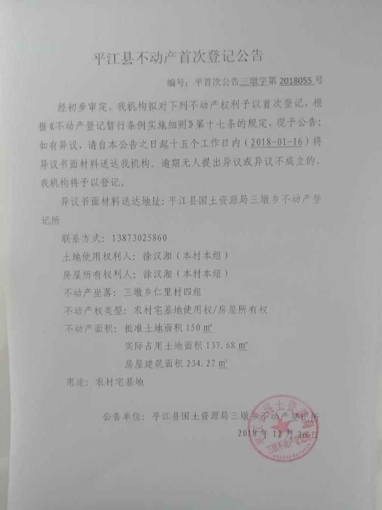 徐汉湘不动产首次登记公告 三墩字第2018055号