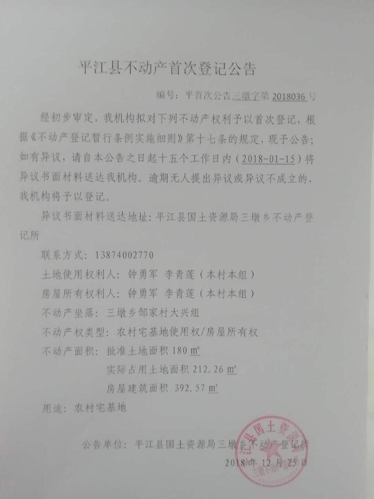 钟勇军 李青莲不动产首次登记公告 三墩字第2018036号