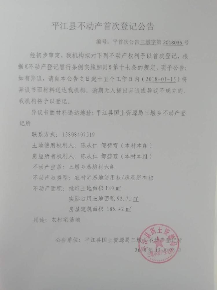 陈从仁 邹碧霞不动产首次登记公告 三墩字第2018035号