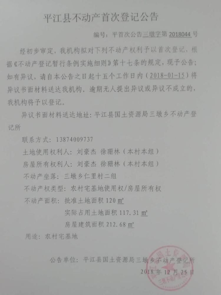 刘豪杰 徐珊林不动产首次登记公告 三墩字第2018044号