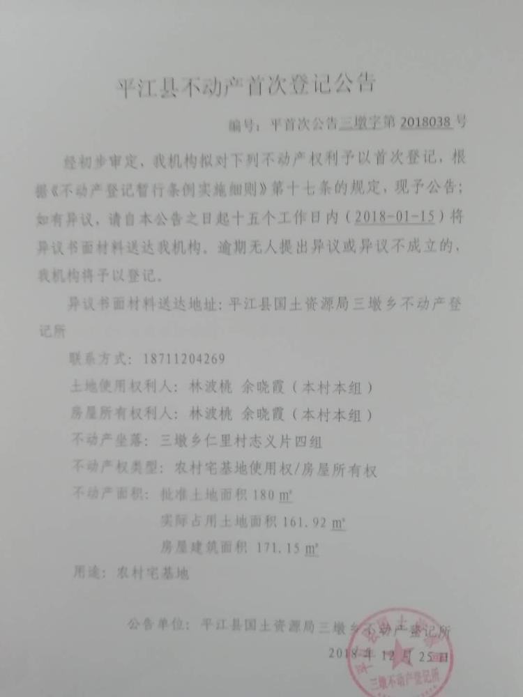 林波桃 余晓霞不动产首次登记公告 三墩字第2018038号