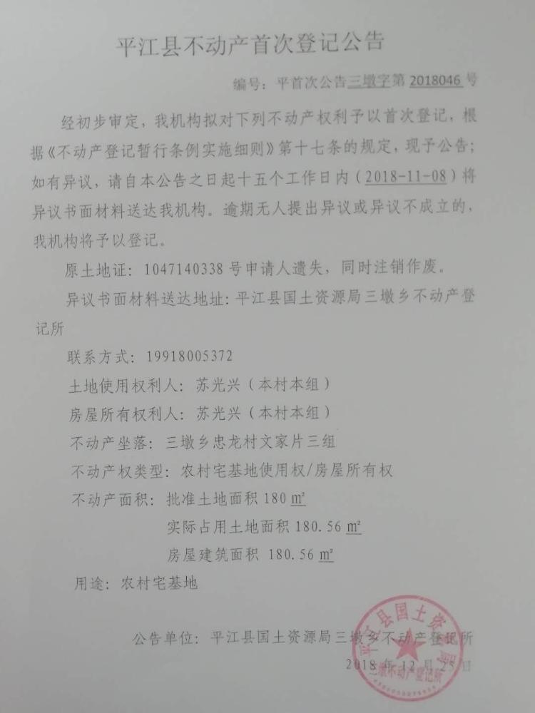 苏光兴不动产首次登记公告 三墩字第2018046号