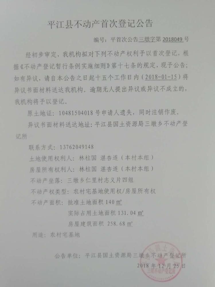林柱国 湛杏连不动产首次登记公告 三墩字第2018049号