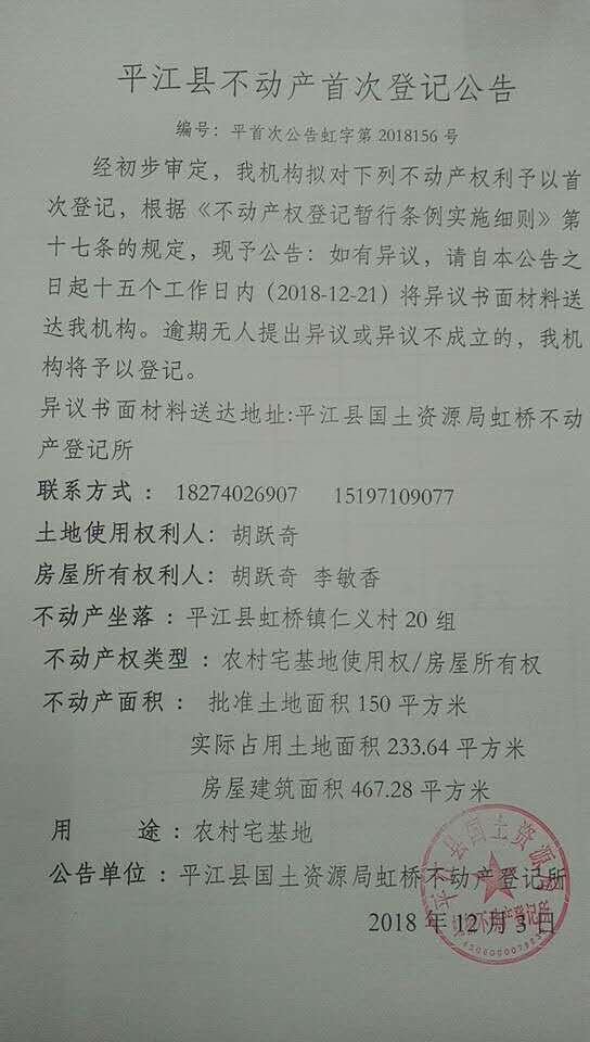 胡跃奇 李敏香不动产首次登记公告 虹字第2018156号