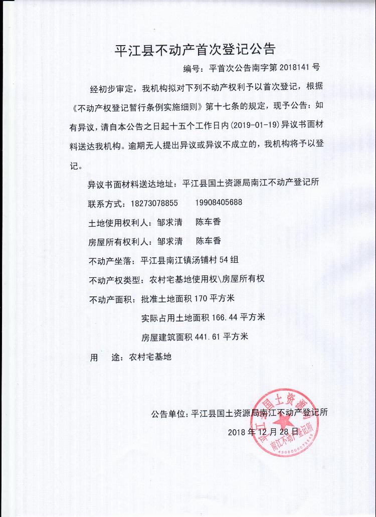 邹求清 陈车香平江县不动产首次登记公告南字第2018141号
