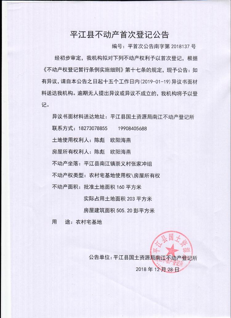 陈彪 欧阳海燕平江县不动产首次登记公告南字第2018137号