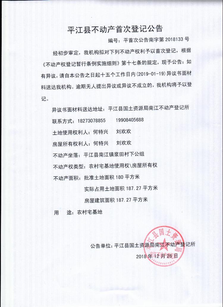何特兴 刘欢欢平江县不动产首次登记公告南字第2018133号
