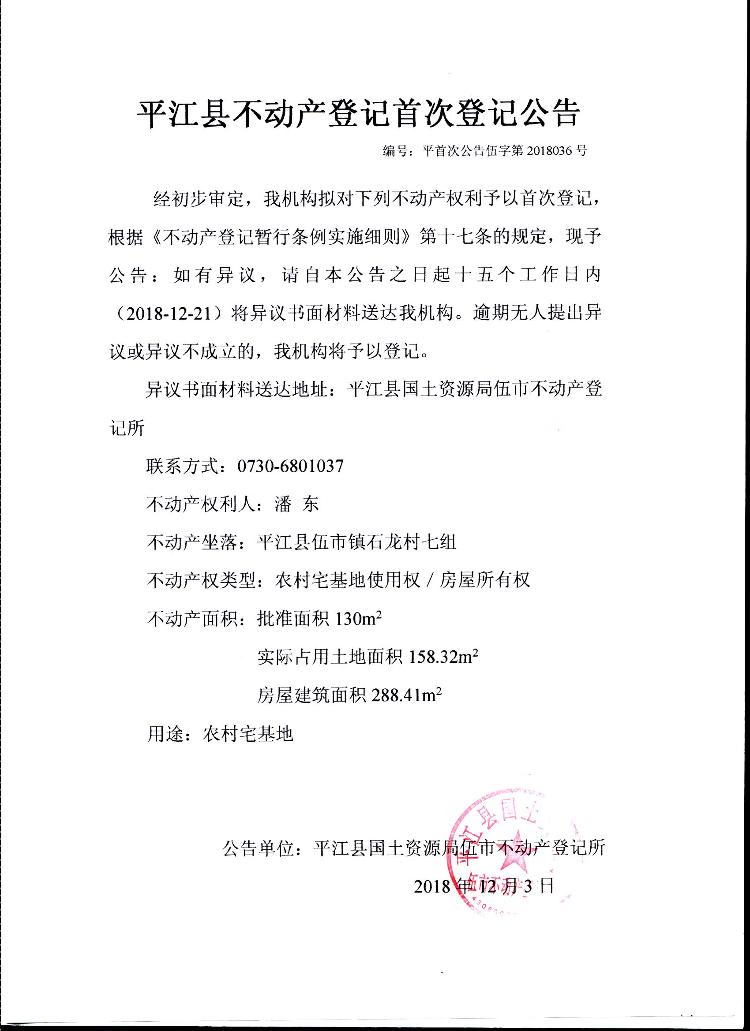 潘东 不动产首次登记公告 伍字第2018036号