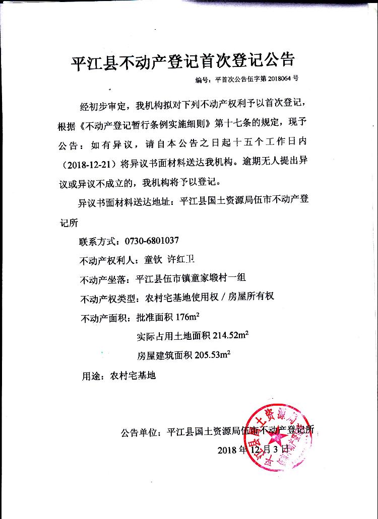 童钦 许卫红不动产首次登记公告 伍字第2018064号