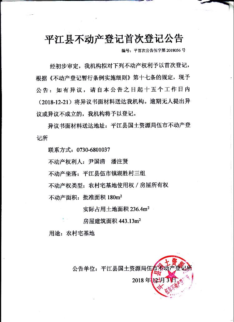 尹国清 潘注贤不动产登记首次登记公告伍字第2018056号