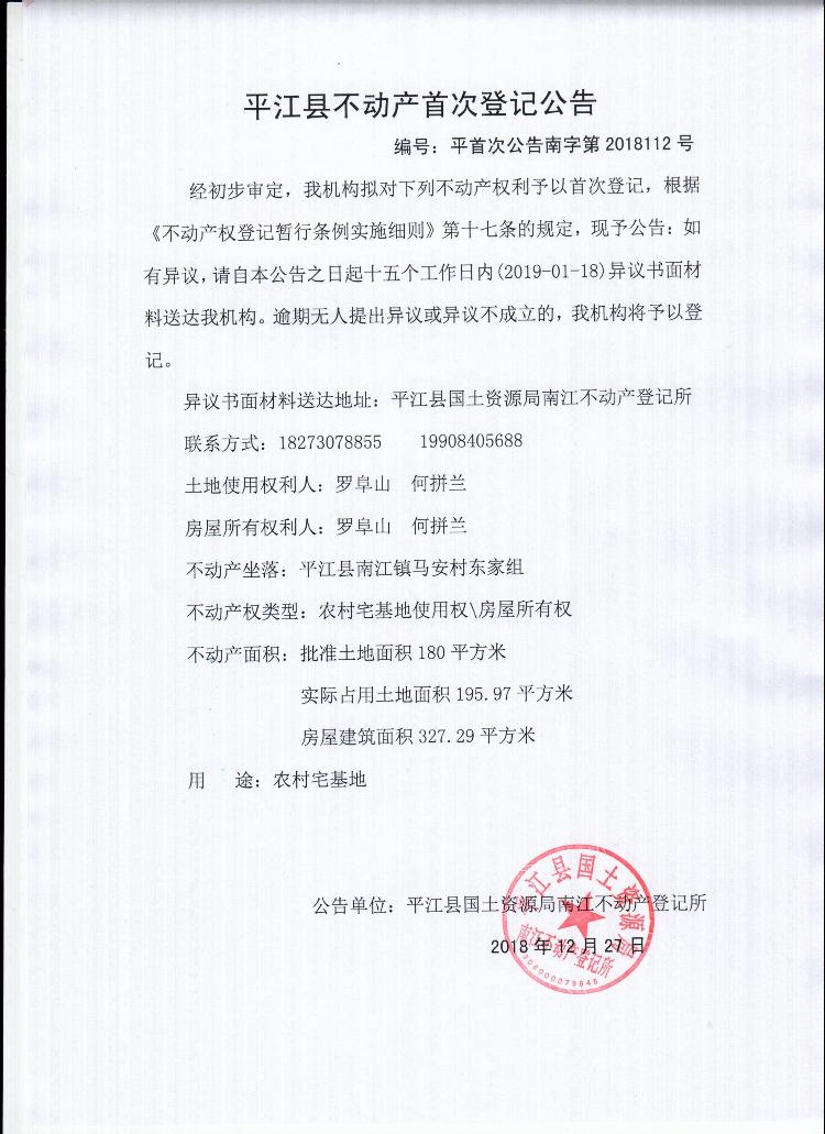 罗阜山 何拼兰平江县不动产首次登记公告南字第2018112号
