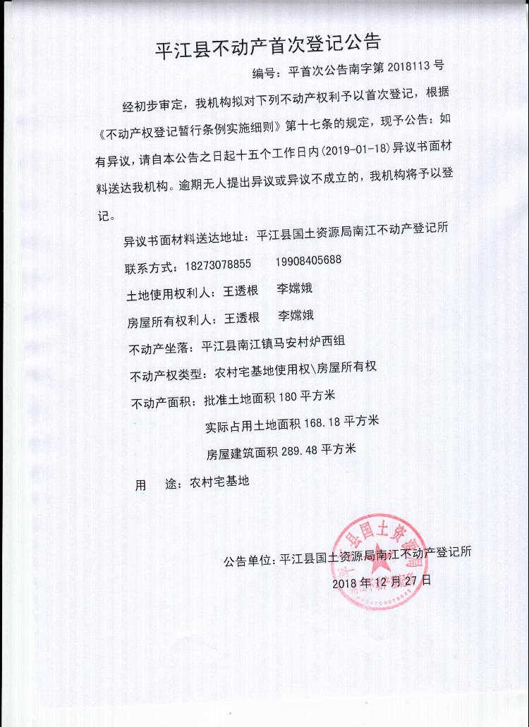 王透根 李嫦娥平江县不动产首次登记公告南字第2018113号