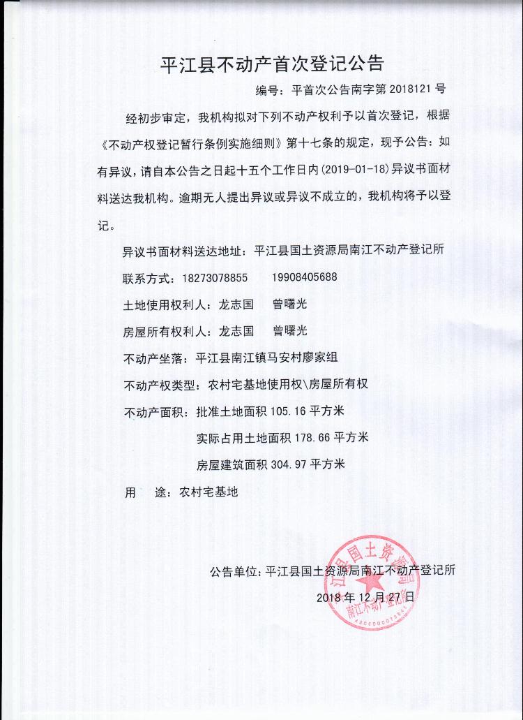 龙志国 曾曙光平江县不动产首次登记公告南字第2018121号