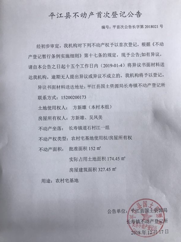 方新雄 吴凤美不动产首次登记公告 长字第2018021号