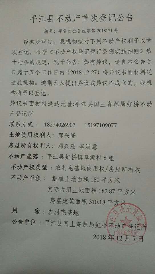 邓兴隆 李满意不动产首次登记公告 虹字第2018171号