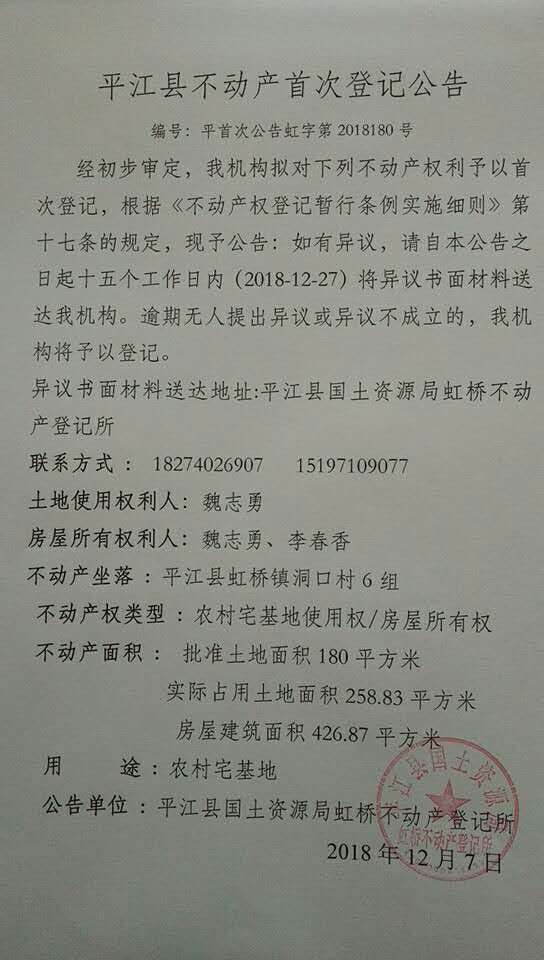 魏志勇 李春香不动产首次登记公告 虹字第2018180号
