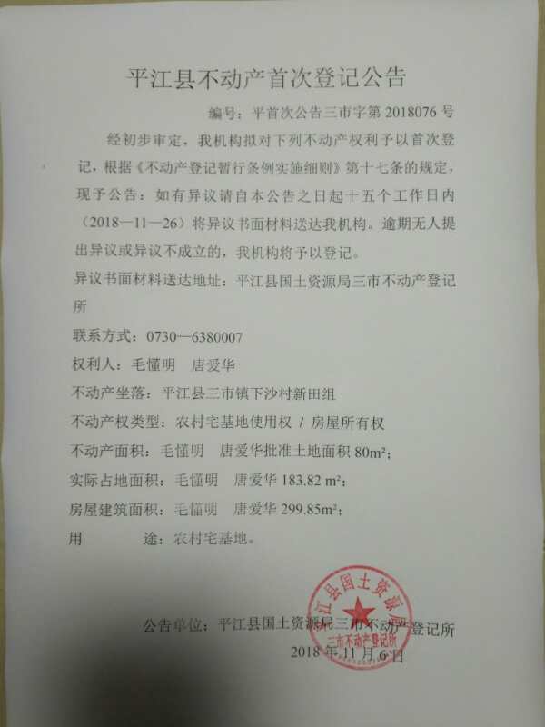 毛懂明 唐爱华不动产首次登记公告 三市字第2018076号